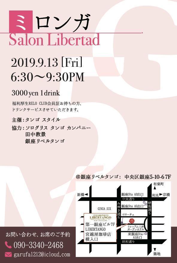 *台風19号の影響で10月12日(土曜日)開催予定でしたYutaka&Mikiさんをゲストにお招きしての銀座Saturdayミロンガは来月11月16日(土曜日)に延期、本日13日(日曜日)盛岡アンサンブルディナーショー&WSは今週10月20日(日曜日)へ変更になりましたので、どうぞ宜しくお願い致します!