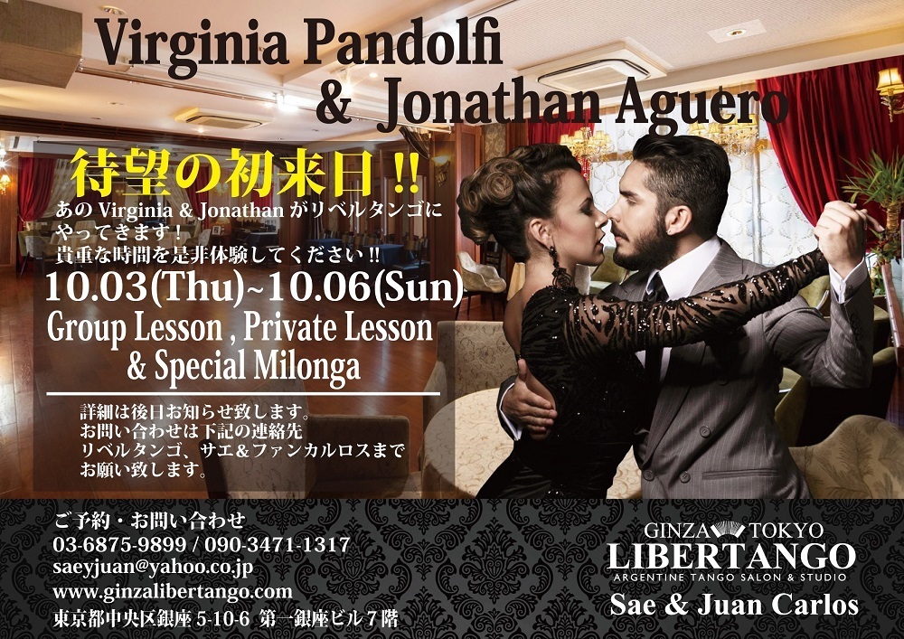 10月3日から招聘していますVirginia&Jonatanのグランミロンガのご予約スタートしています! スペシャルグループレッスンやテクニッククラスはご予約制ではありませんが、テクニッククラスは勿論ですが、グループはおひとりでのご参加もいらっしゃいますので、男女比の調整やサポートスタッフなどのご用意など、30名くらいでのレッスンを予定していますので、出来ましたら事前のご予約をお勧め致します! プライベートレッスンのご予約も受付中です!