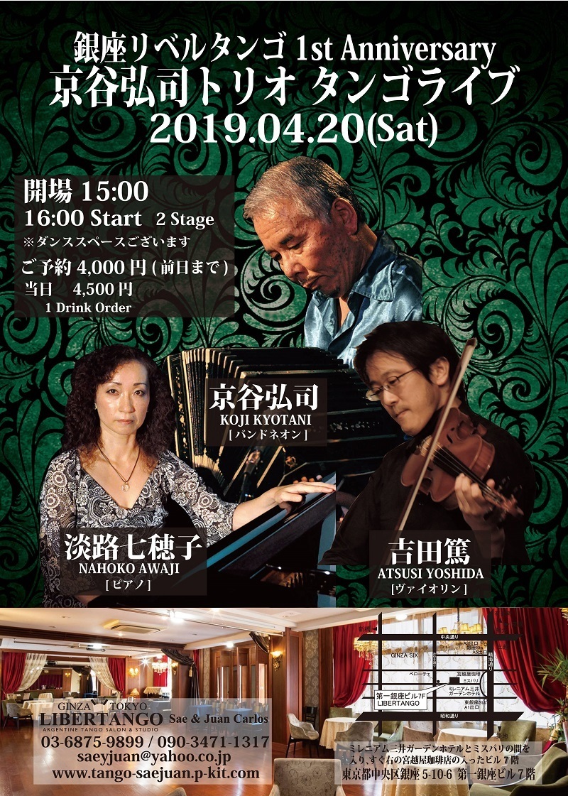 あっという間ですが、皆様に支えられて銀座リベルタンゴも1周年を迎えることが出来ました これからもダンスと音楽、皆様と楽しいひとときをご一緒出来ます様、精進してまいります 引き続きどうぞ宜しくお願い申し上げます 皆様のお越しをこころよりお待ちしております