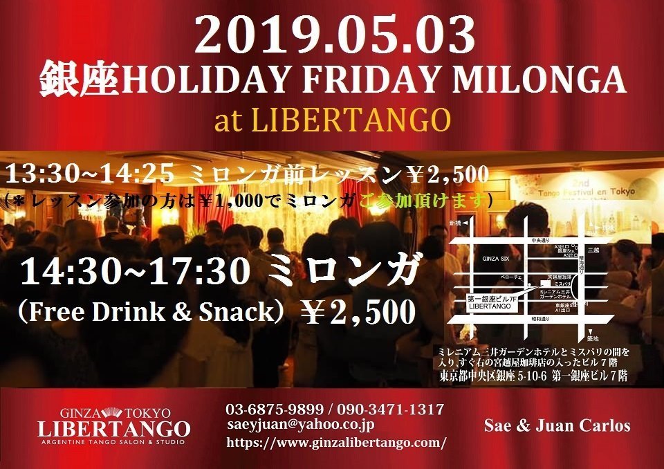 そして5月1日水曜日は「令和」の新しい時代のスタート! 銀座Wednesdayミロンガの開催時刻を17時からに早め、担当レギュラーのToki先生、DJ:Masaoさんと皆さんとご一緒にたのしいひとときを過ごしましょう!!(^O^)(*^-^*)