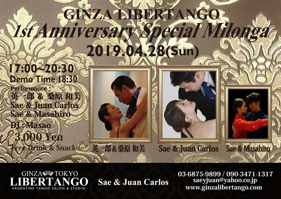28日(日)は17時~20時半まで少し延長して銀座リベルタンゴの1st Anniversaryスペシャルミロンガの開催です! 火曜夜と水曜昼の担当講師の桑原和美先生とリベルタンゴで不定期開催のサロンリベルタを開催しています大矢英一郎先生をゲストパフォーマンスでお招きし、そして週末などスタッフとしてアシスタントしているMasahiroと私のパフォーマンス、水曜夜を担当していますToki先生はこの日どうしても所用があり、参加出来きませんが、5月1日水曜日に令和スペシャルミロンガでパフォーマンスをお願いしています! WednesdayミロンガのDJを担当していますMasaoさんに28日の選曲も担当して頂きます♫ 28日は皆様へプレゼントの抽選会もご用意していますのでお楽しみに!(^O^)