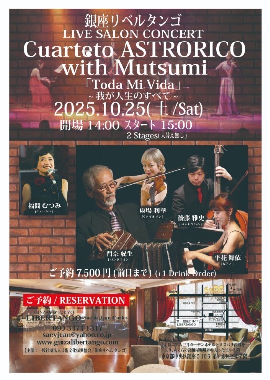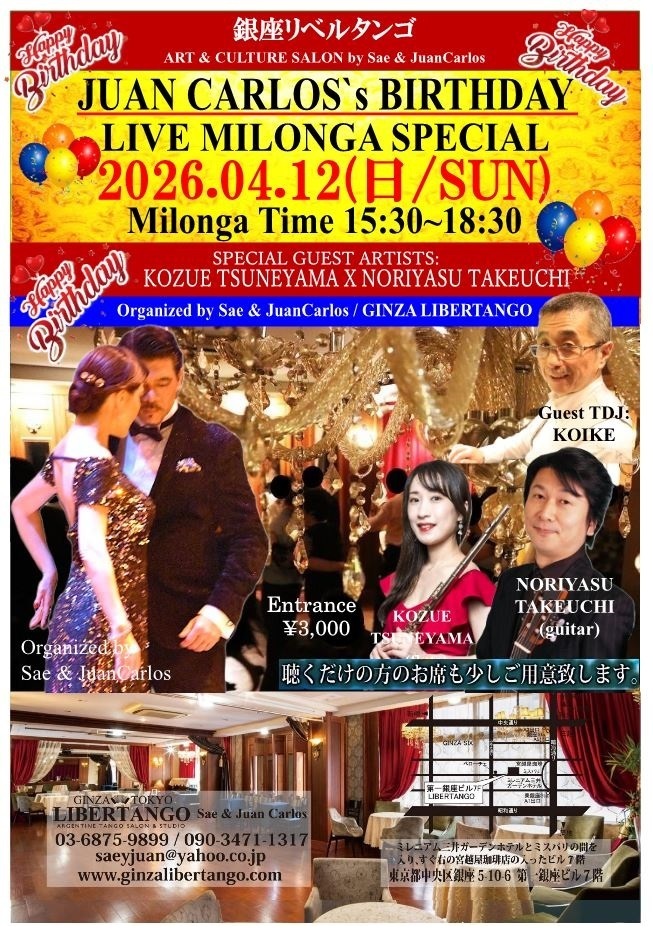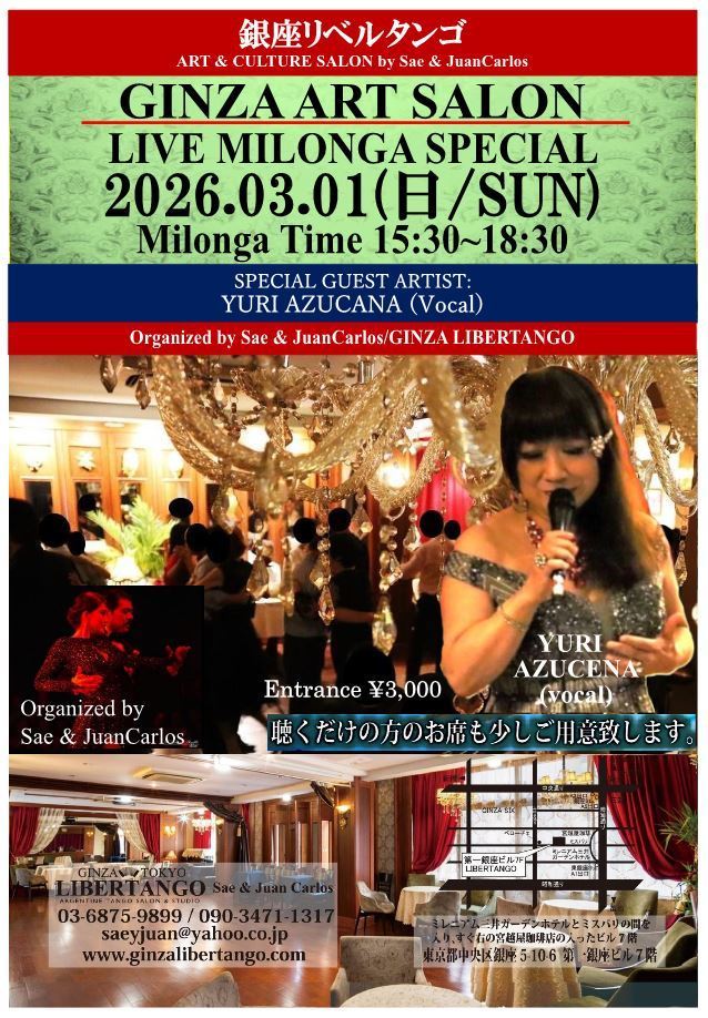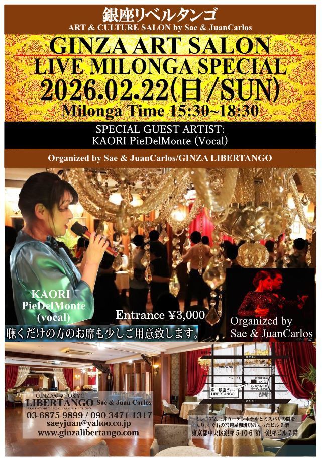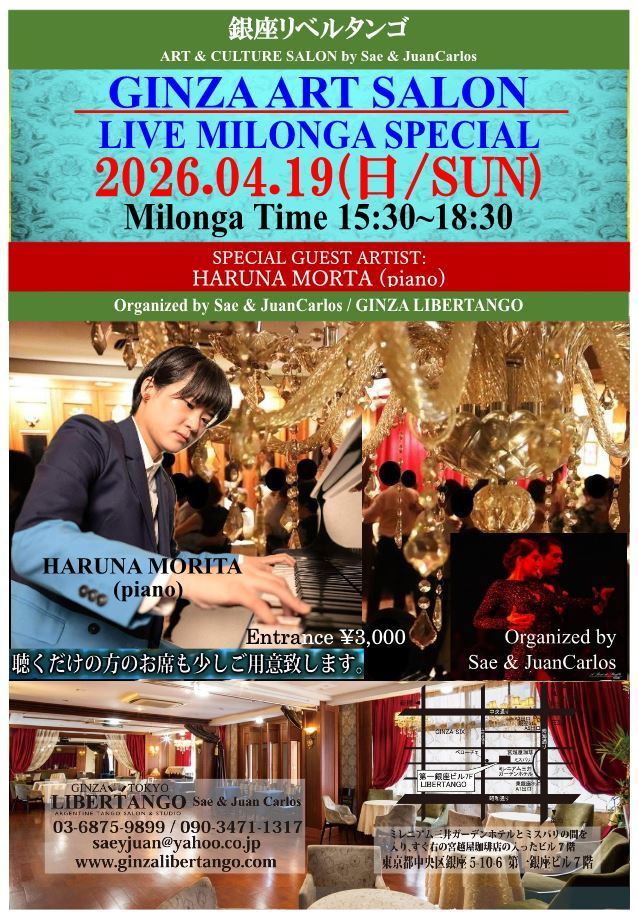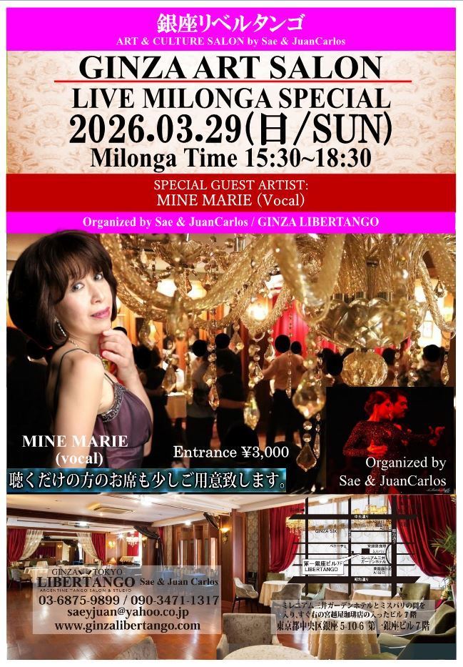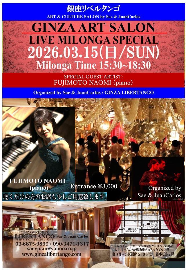 ◆ミロンガ(ダンスパーティー)で生演奏が入る場合はライブミロンガとの記載になります。*ダンスがメインになるレイアウトですが、聴く方の為に演奏家の前にお席を設けますのでご予約の際にお気軽にお申し付け下さいませ。