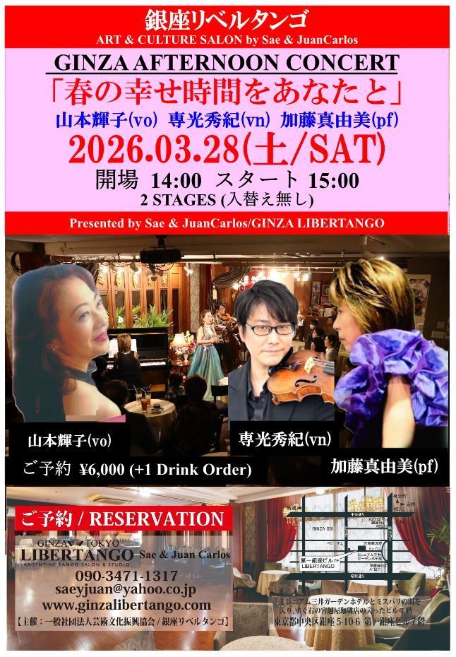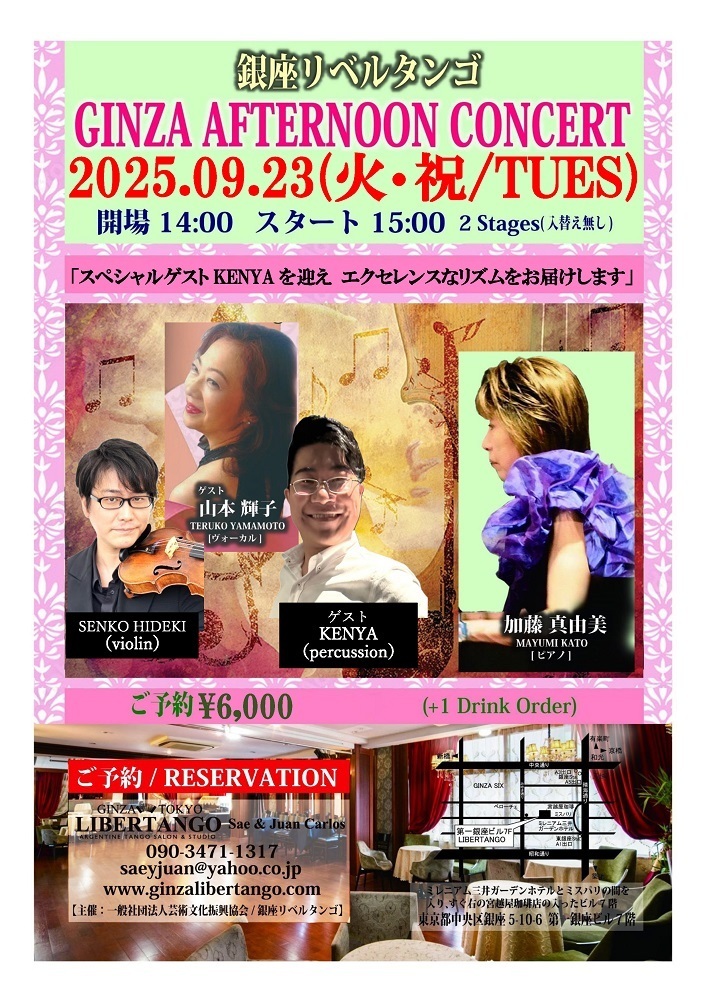 ◆銀座リベルタンゴでは音響設備にもこだわり、素晴らしい演奏家をお招きして、ゆったりとした空間でライブ(生演奏)をお愉しみ頂けます。*聴く方がメインのレイアウトになりますが、お席の後方にダンススペースをご用意致します。