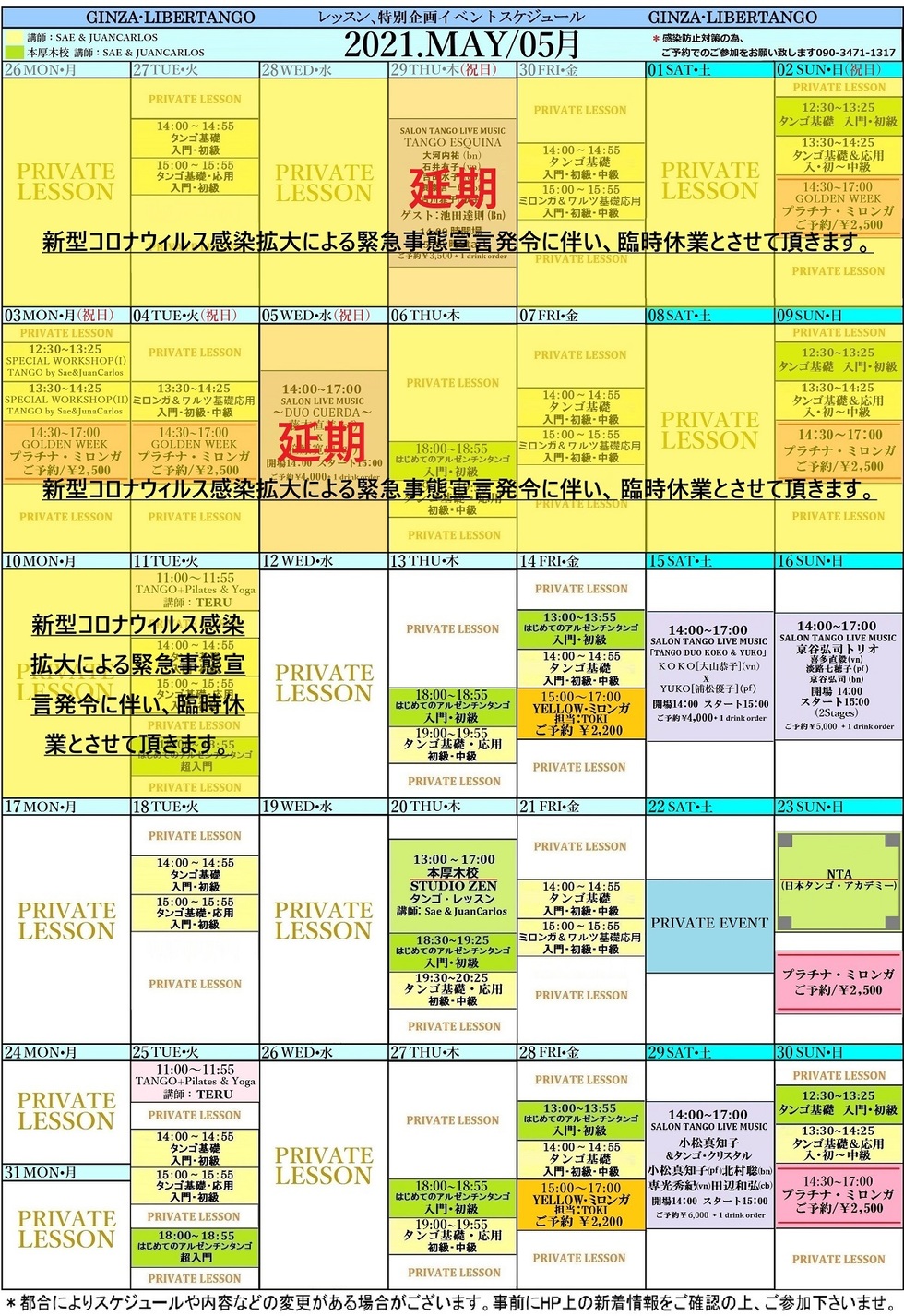 おはようございます! 7月! 今年の半年を過ぎ、今月のオリンピックも現在感染者数が増え混沌としていますが、感染防止を忘れずにしっかり対策しながら7月も元気にまいります! 7月のスケジュールです(^O^) レッスン、ライブ、ミロンガ、イベントと盛り沢山でお楽しみ頂きます♫ 明日のイエローミロンガはToki&スサーナのデモがあります! デモは15:50~皆さん是非応援よろしくお願いします!!(*^-^*) そして4日日曜日はプラチナミロンガ! 夏タイムで14時からオープンクラス、15時~17時半の開催です! 感染防止対策の一環として、全てご予約(当日可)でのご参加をお願いしています どうぞ宜しくお願い致します