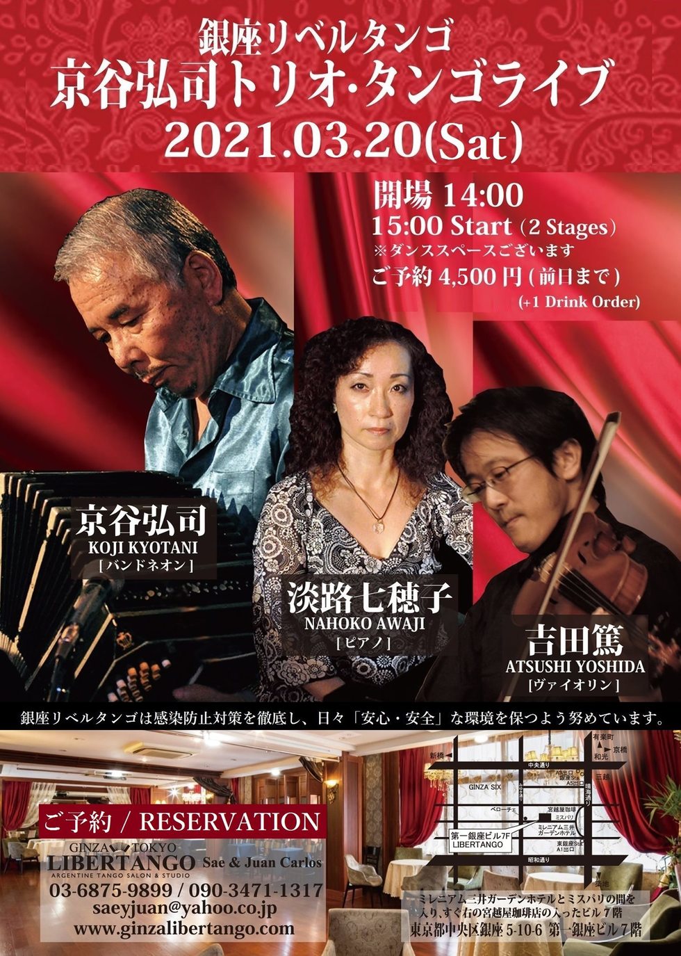 次回の京谷弘司トリオタンゴライブは春分の日、3月20日土曜祝日です!♫