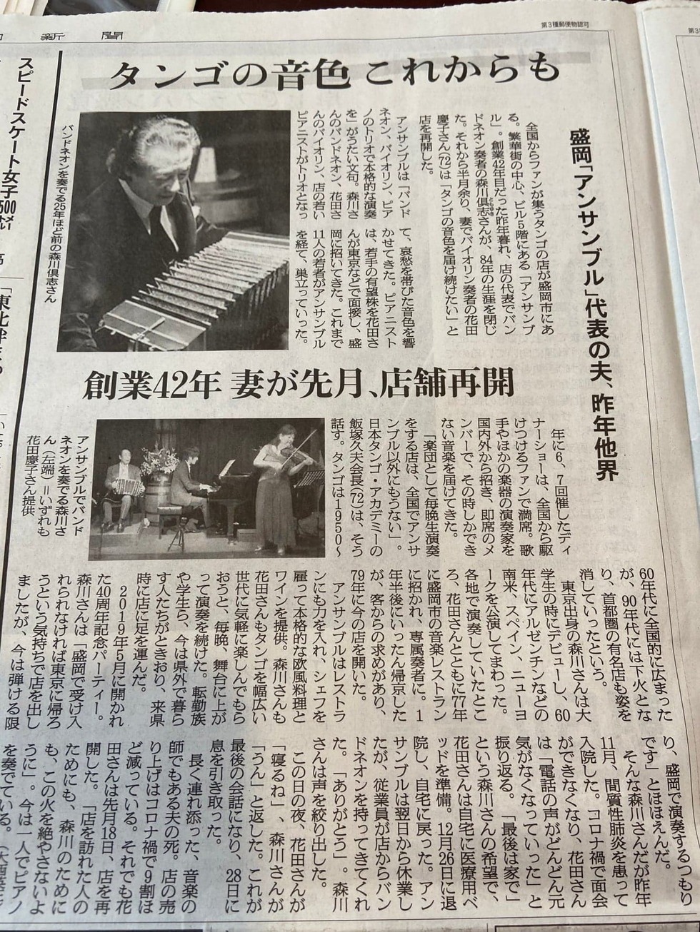 1月14日にブログで書きましたが、盛岡アンサンブル、バンドネオン奏者森川ともゆき氏のご逝去を受け、朝日新聞記者の方から森川氏のお話をお尋ねしたいとのご連絡があり、私達だけでは、とすぐに盛岡アンサンブルを42年の長い間、森川氏とご一緒に支え、今後もアンサンブルを守っていかれるヴァイオリニスト花田慶子さん、そして文献などおお話をして頂く為、タンゴアカデミー会長にもご協力頂き、記者の方と直接お話をして頂いたのですが、その朝日新聞の記者の方の記事が載りました! 今朝、盛岡アンサンブルの応援団の方が朝日新聞の記事を送って下さったので取り急ぎ載せます!! 朝日新聞記者の方にも感謝致します!! 是非一読下さいませ *これは朝日新聞岩手版で、明日全国版が発売されますよ!!(*^-^*)
