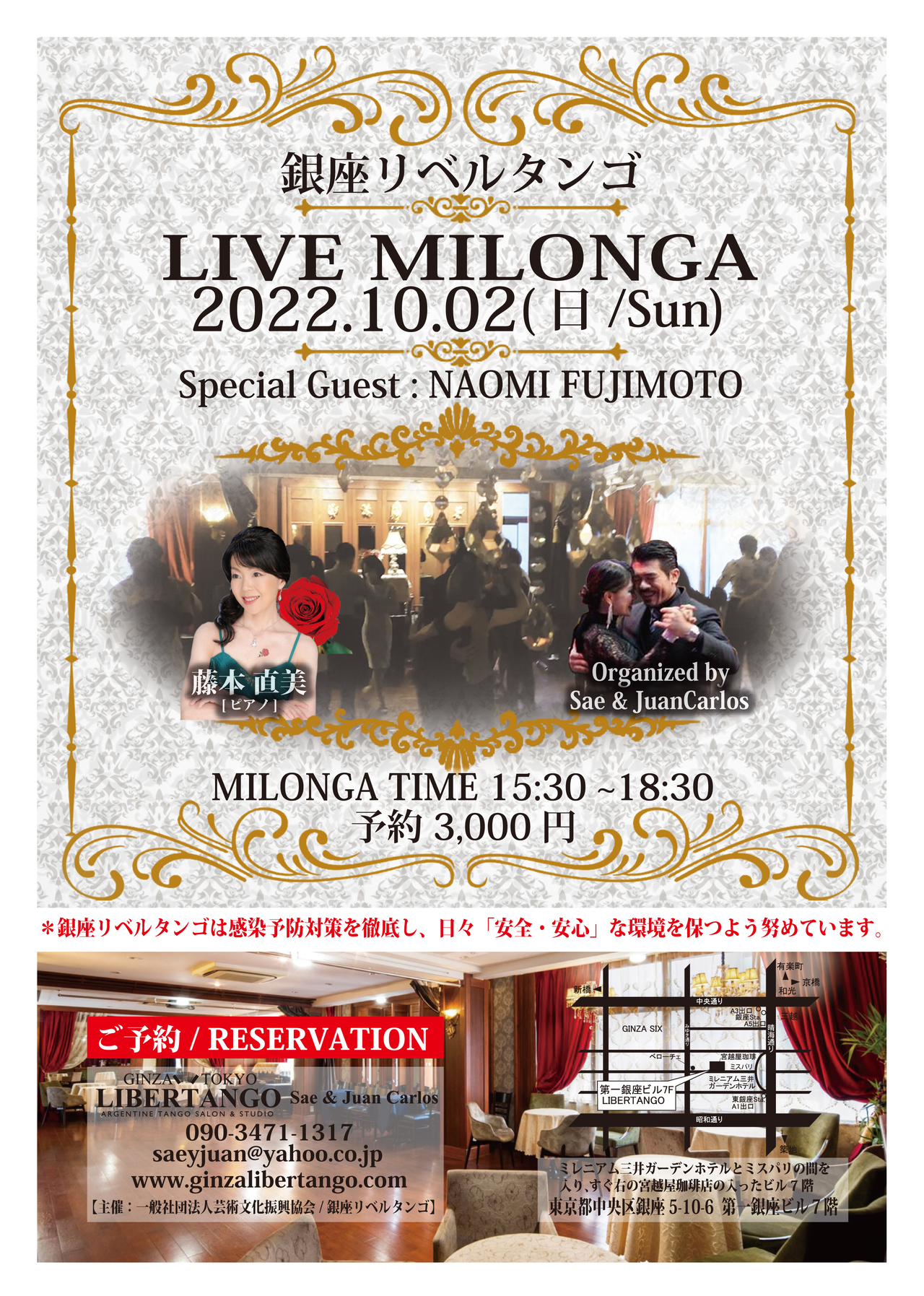 そして24日日曜日はレッスン後、15時半~お久しぶりのゲストなしでのシンプルなプラチナミロンガになります! 今週も感染防止対策を忘れず元気にレッスン、ライブ、ミロンガと豊かな心地よいひとときをお楽しみ下さい(^-^)
