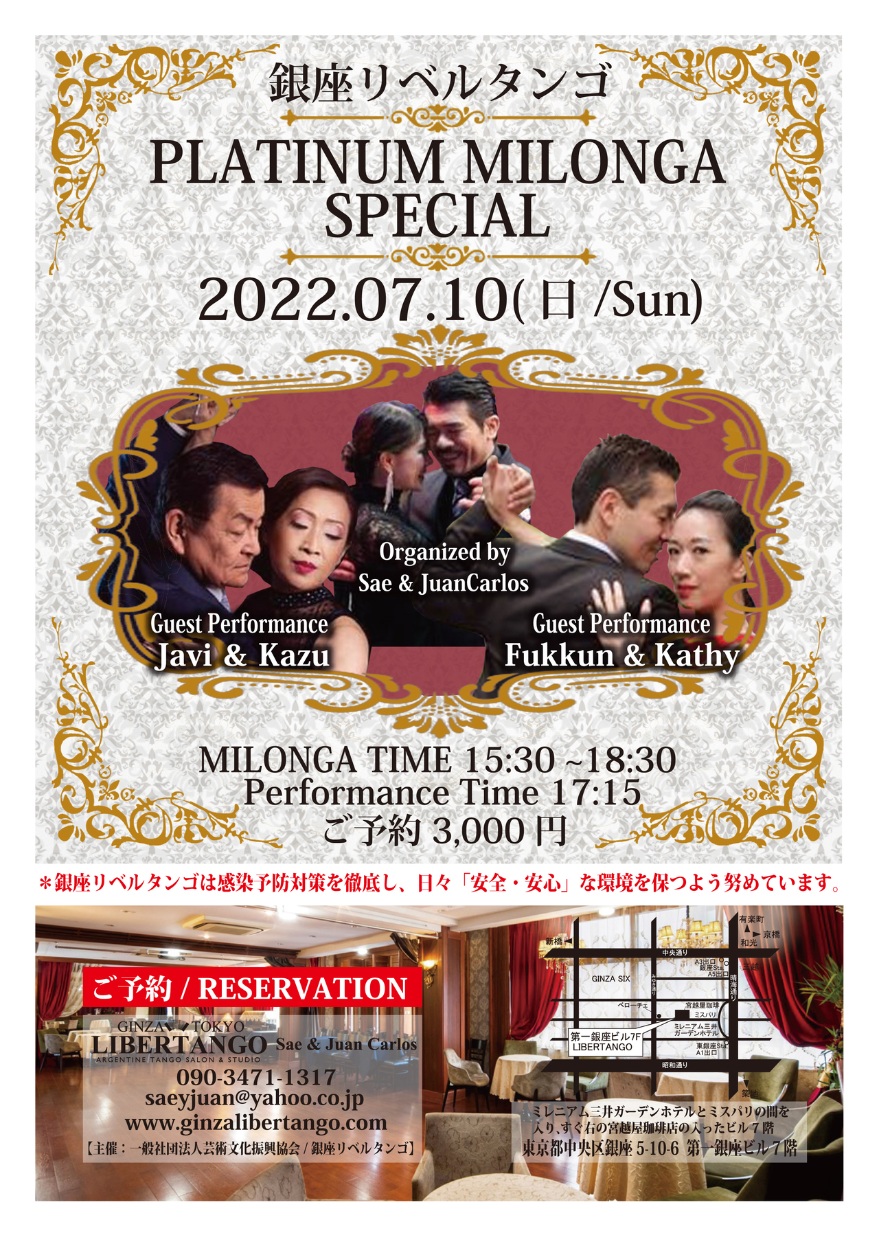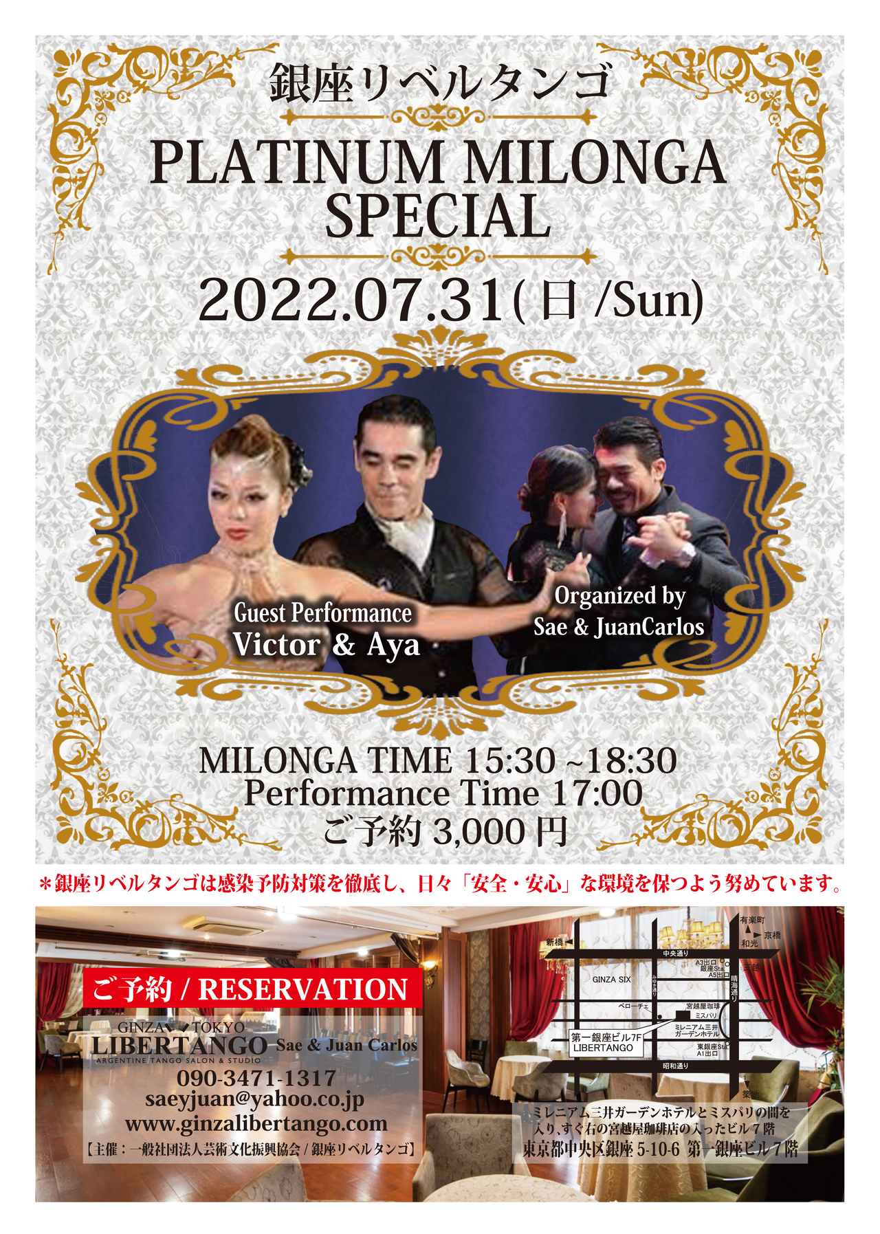 昨日も猛暑の中、レッスン、ミロンガ、とご参加頂いた皆さん、お疲れ様&有難う御座いました!(昨日の写真は下に)ミロンガではゲストパフォーマンスに初のビクトル&アヤさんも素敵でした! 今週7日日曜日のプラチナミロンガはゲスト無しのシンプルなミロンガです 換気やご予約での人数制限などの感染対策、心地の良い空間と踊らずにはいられない選曲をご用意して、皆様のお越しをお待ちしてます♬ 併せて来週のミロンガ情報も!