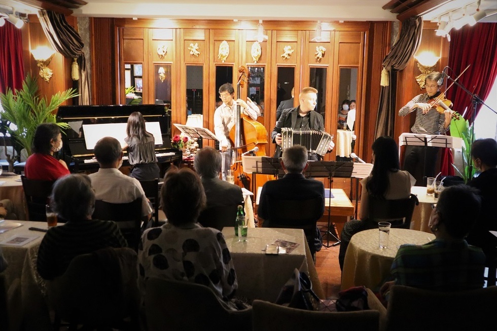 さて、明日はご案内してまいりましたお待ちかね、バンドネオンVille Hiltula、ヴァイオリン吉田篤さん、ピアノ青木菜穂子さん、コントラバス田中伸司さんのタンゴライブです♬ まだお席ございます!