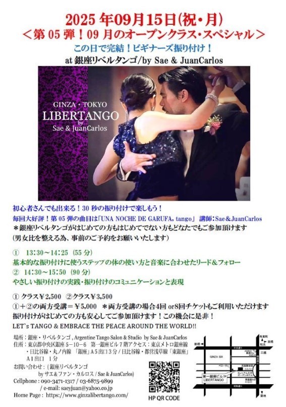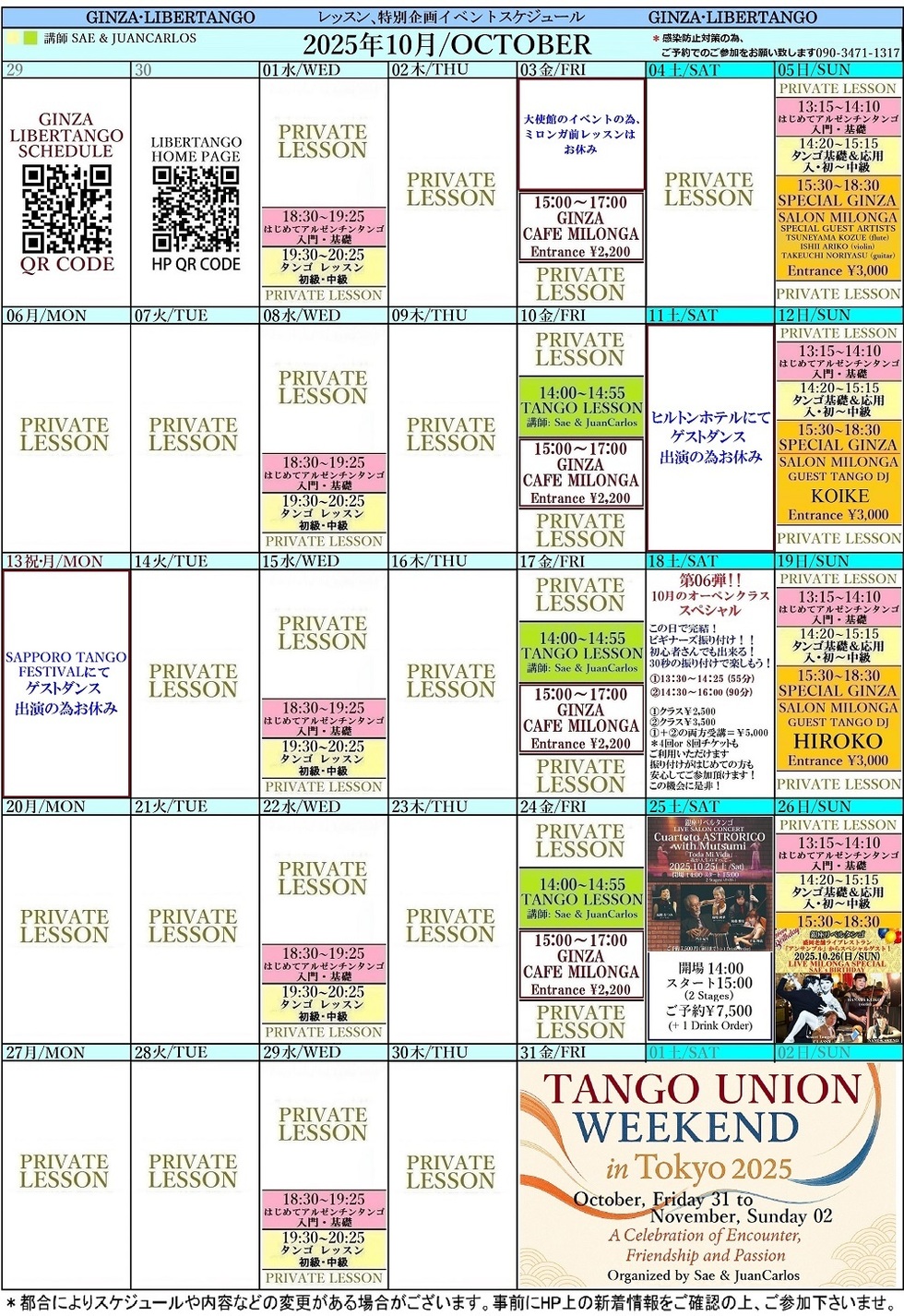 26日(金)&28日(日)のレッスン、ミロンガと楽しみにご予定されていた皆さまにはご迷惑をおかけしてしまいますが、翌週10月は通常通り開催いたしますのでどうぞよろしくお願いいたします