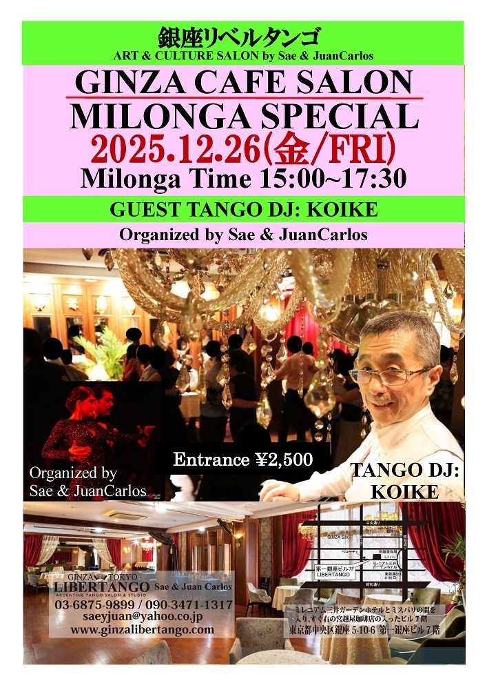 明日26日金曜は14時からのレッスン後、15時から17時半はDJ: KOIKEさんをお招きして、スペシャルカフェミロンガの開催です!