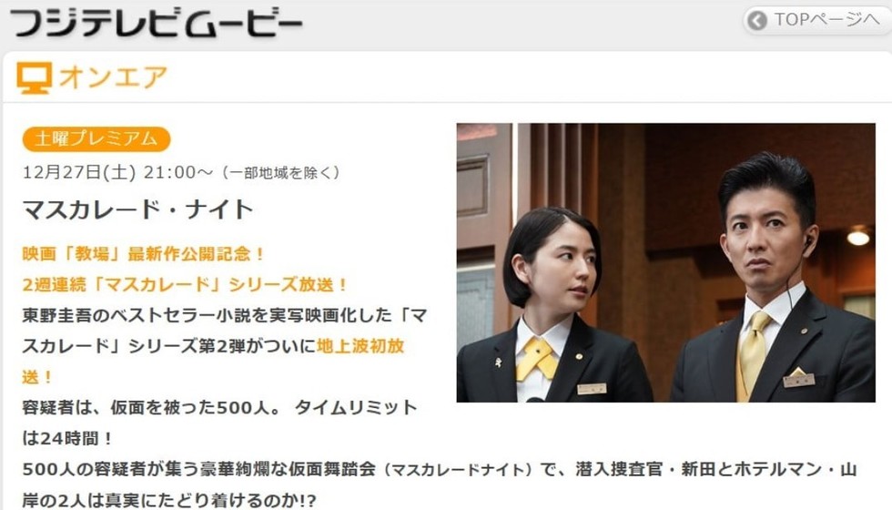 今週27日土曜日、夜9時~東野圭吾原作・主演木村拓哉さん&長澤まさみさん映画「マスカレードナイト」がフジテレビで地上波放送されるそうです!
