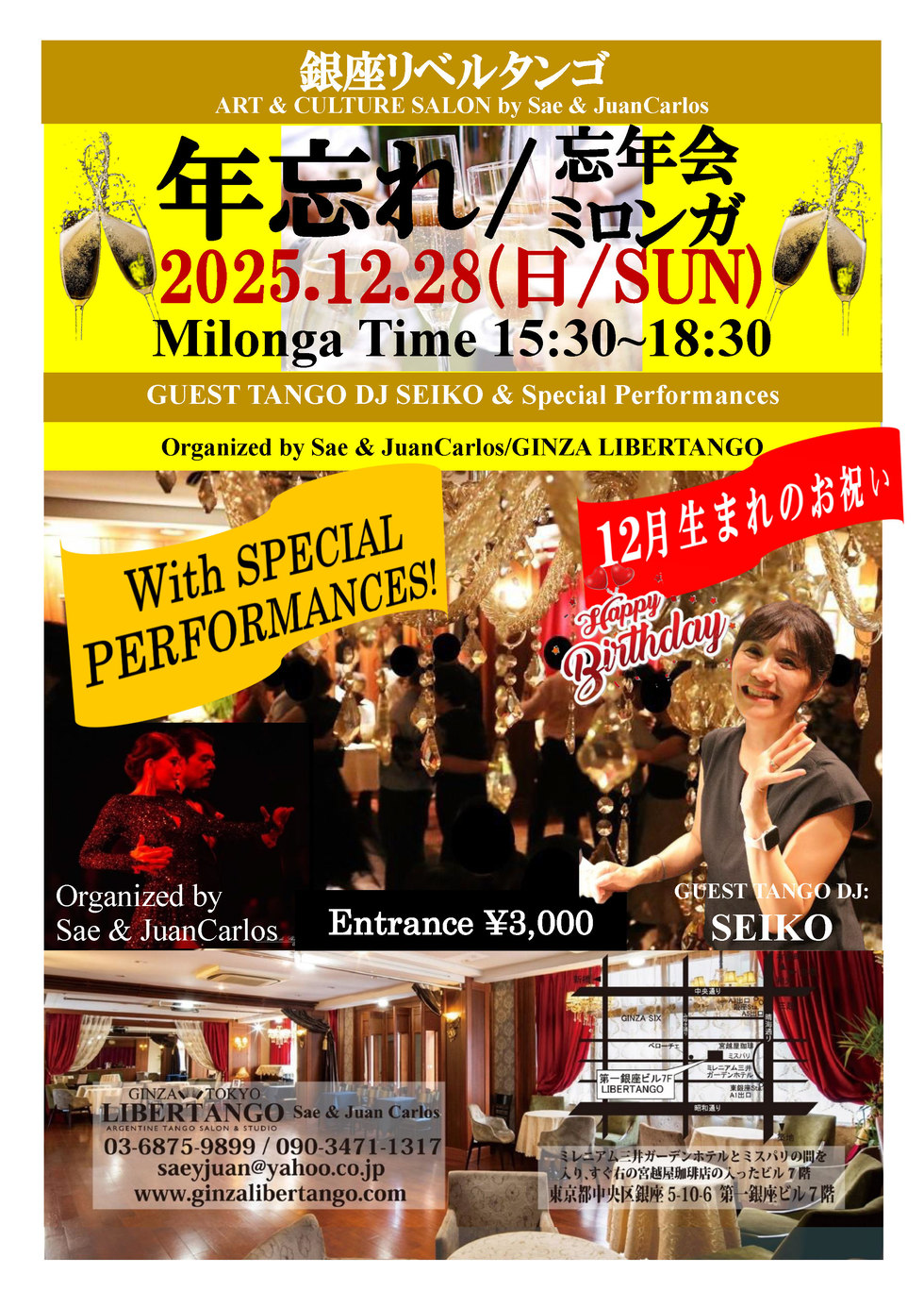 14:20~オールレベルオープンクラス15時半からはDJ:Seikoさんをお招きして、今年のラスト、踊りおさめスペシャルミロンガの開催です♬