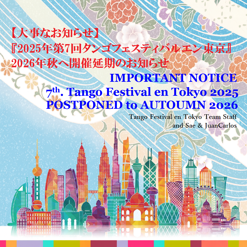 2025年に予定しておりました第7回タンゴフェスティバルエン東京は、更なる充実と進化を目指し、2026年に開催を延期することとなりました