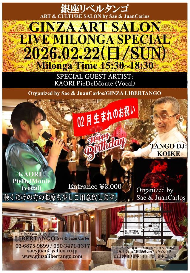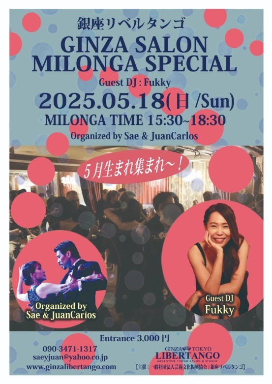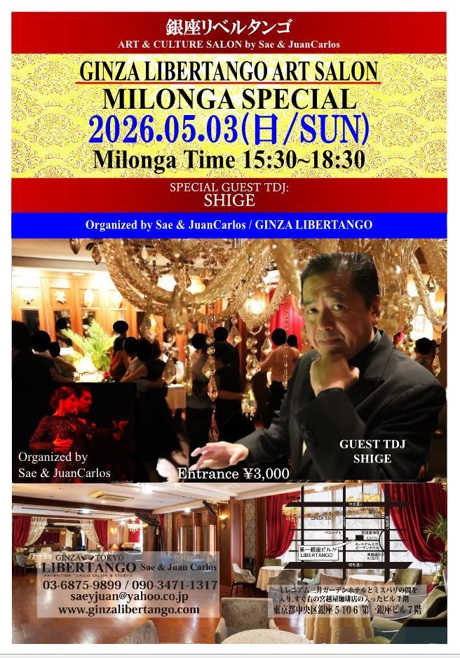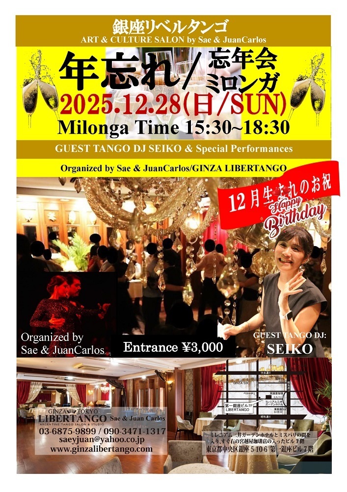 ☆ミロンガパーティー ¥2,500(税込)*1クラス参加で¥1,500、2クラス参加で¥1,000でご参加頂けます (スペシャルミロンガは料金が異なりますので、ご確認ください)
