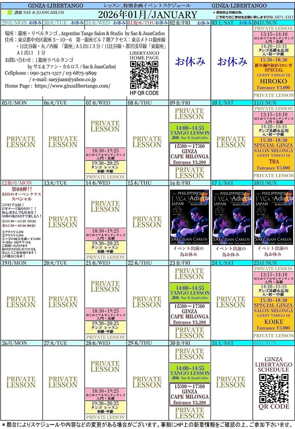 JuanCarlos先生 ¥12,000(税込) Sae先生 ¥12,000(税込) ペアレッスン¥15,000(税込)